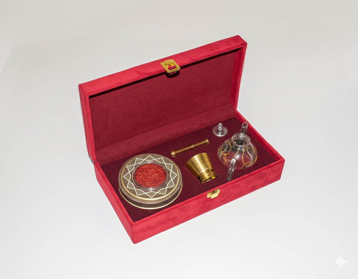 پک کادویی سهند شامل ظرف طرح خاتم با زعفران سرگل، قوری پیرکس و هاون برنجی طرح جام — هدیهای اصیل و زیبا با امکان سفارشیسازی وزن زعفران و رنگ بستهبندی برای سفارشهای خاص و شرکتی.
